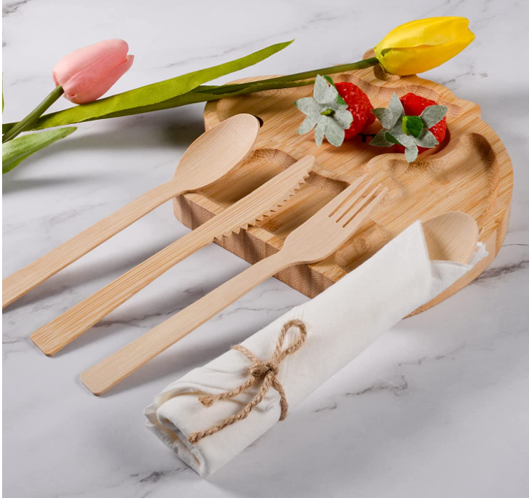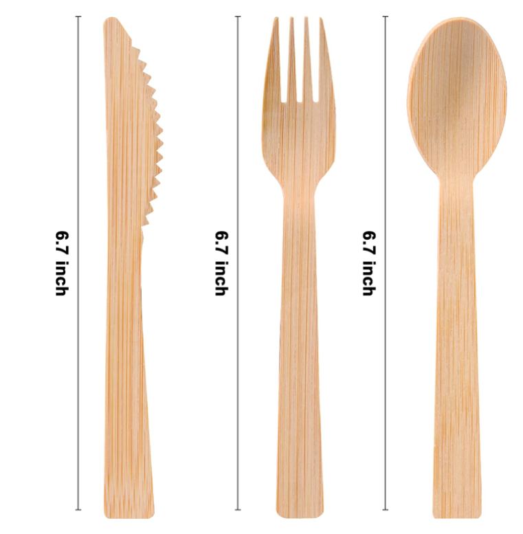 Bamboo fork knife spoon are tough and extremely durable, yet as lightweight as paper or cardboard; resist leaking and sagging, handles heavy entrees, grilled meats, etc.